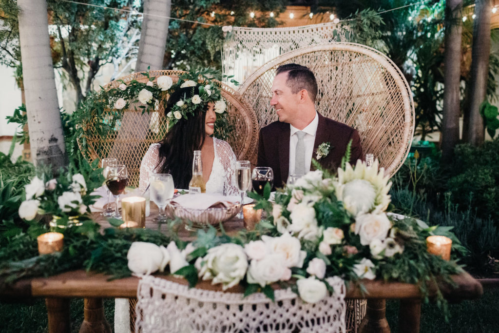 They chose a rustic sweetheart table, which their florist, Wildflower of San Clemente, covered in lush greenery that matched the peacock chairs brought from the couple’s home.